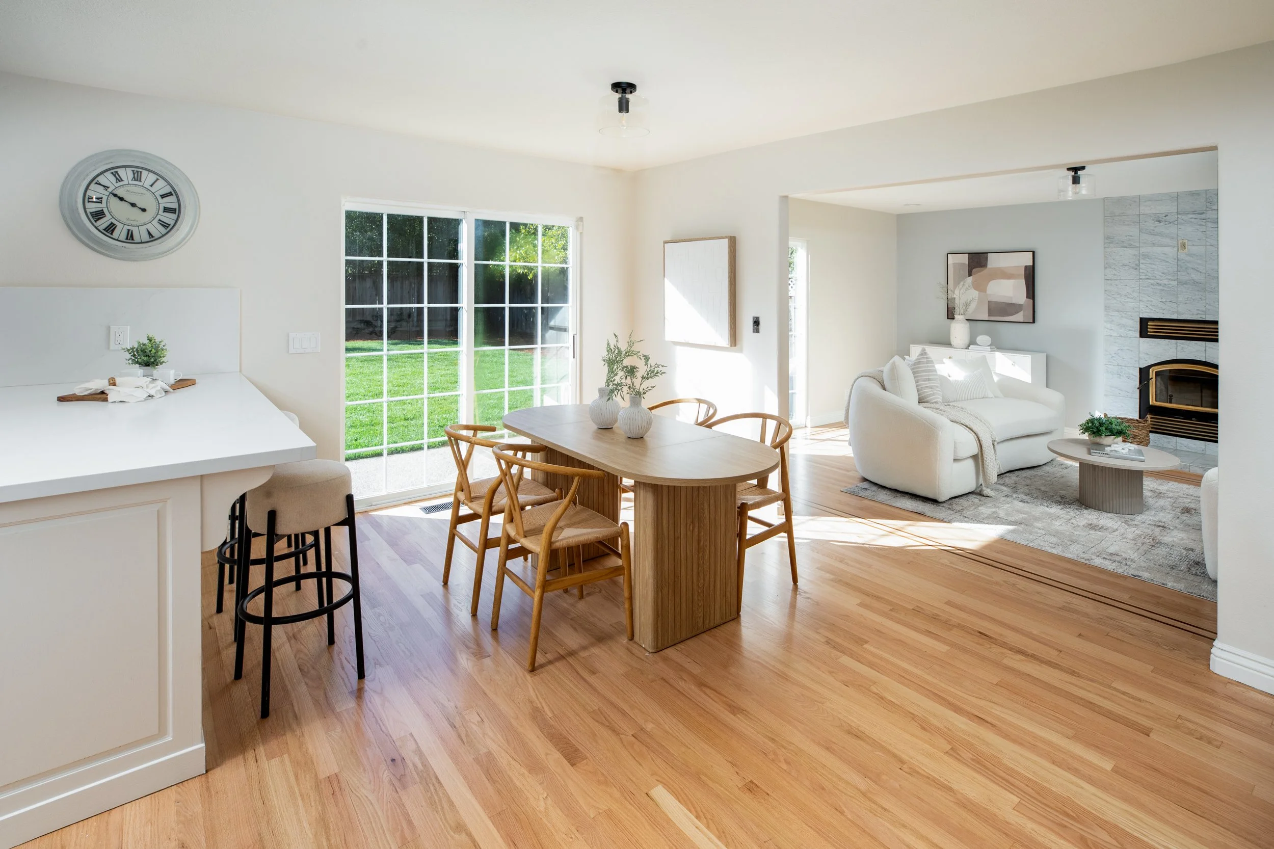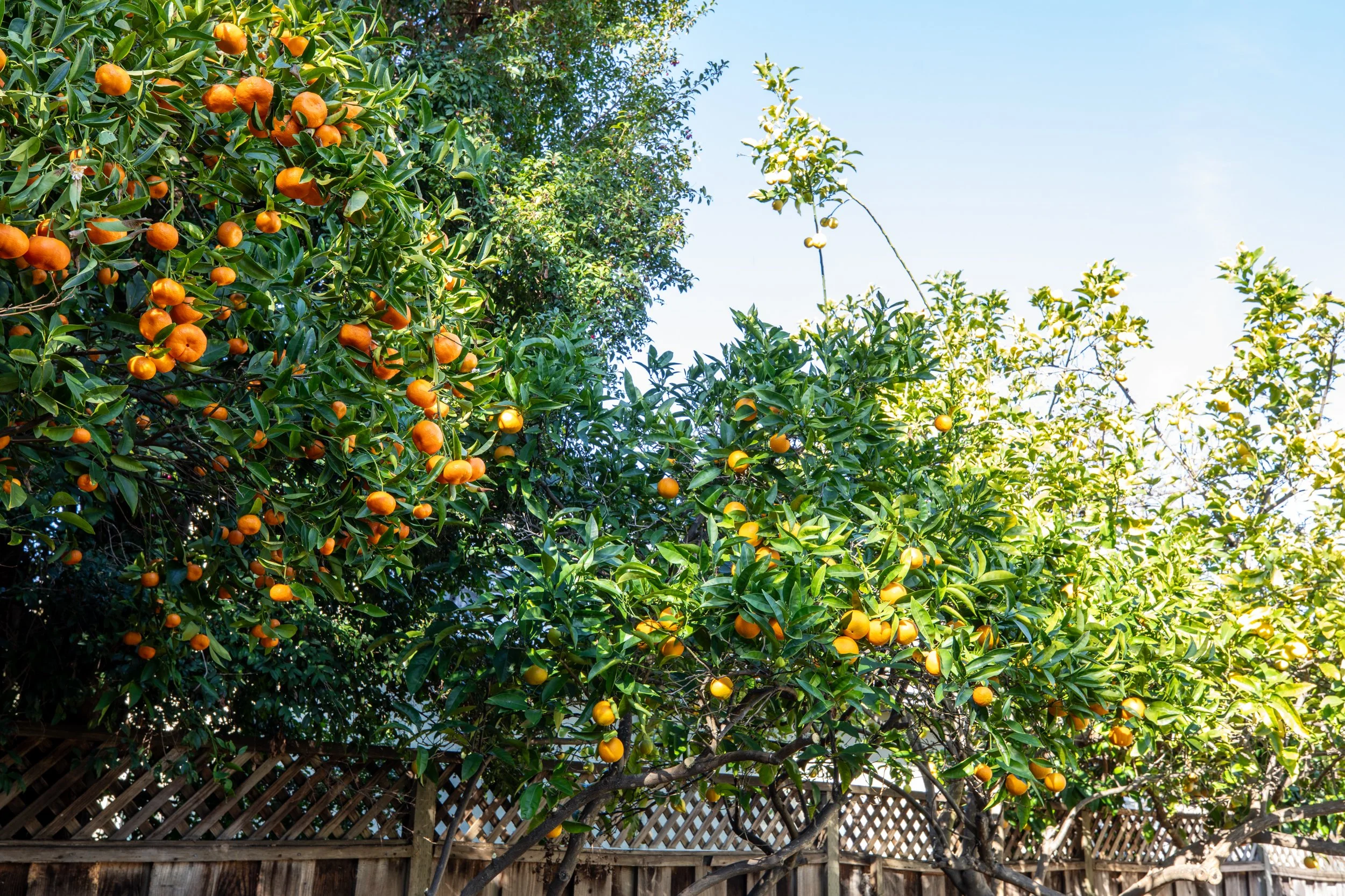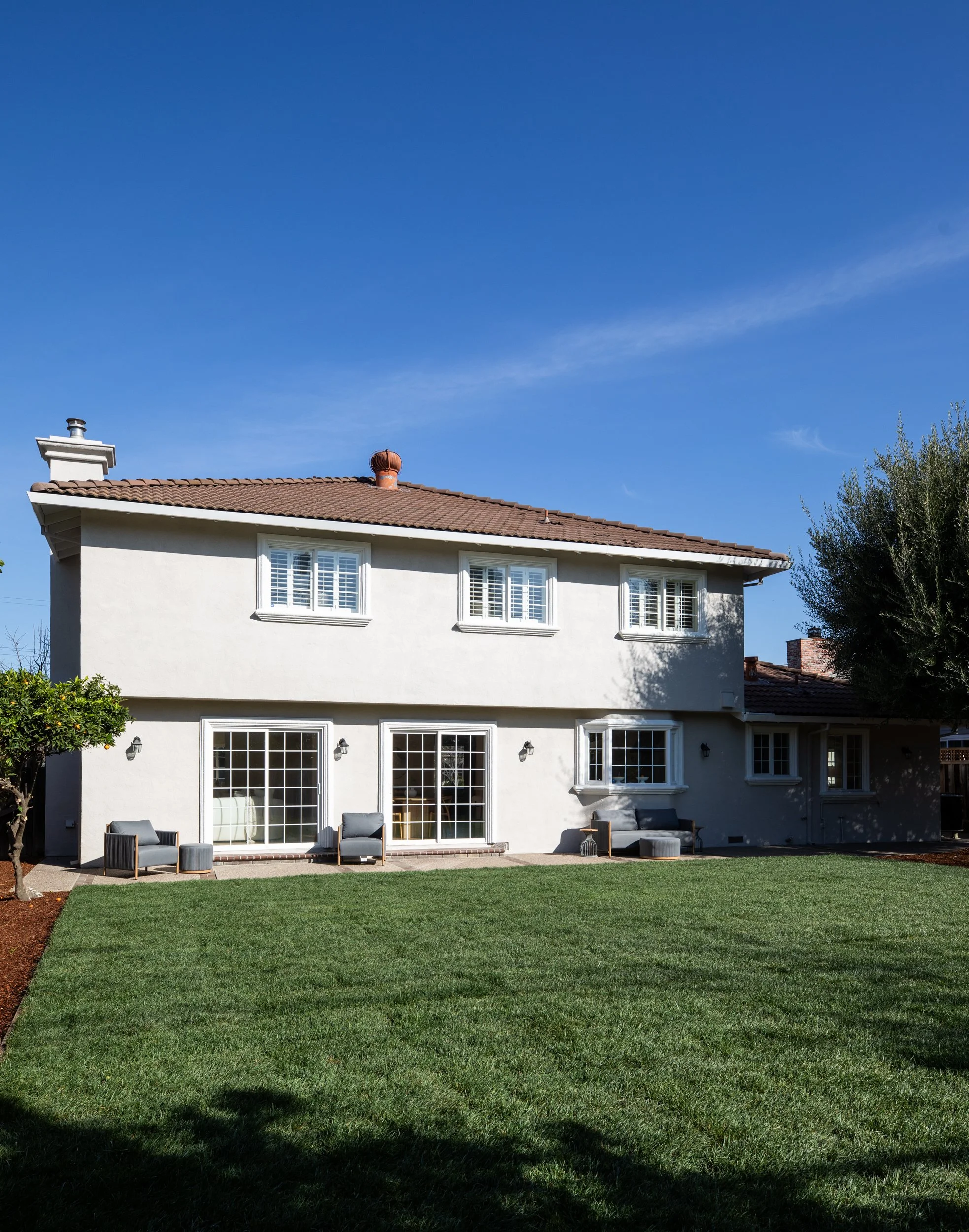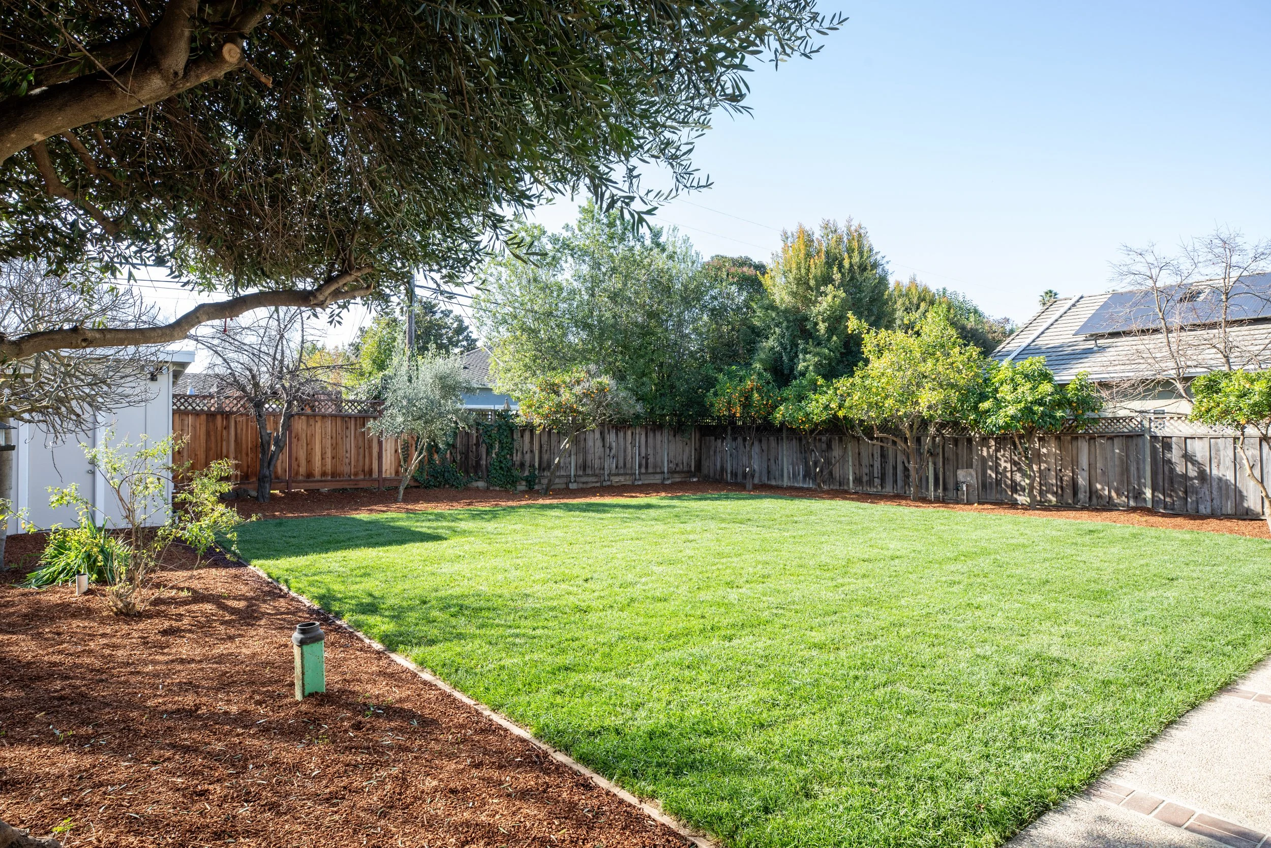 Professionally landscaped flat front and back yards with mature fruit trees, offering ample space for a pool, ADU, or outdoor entertaining