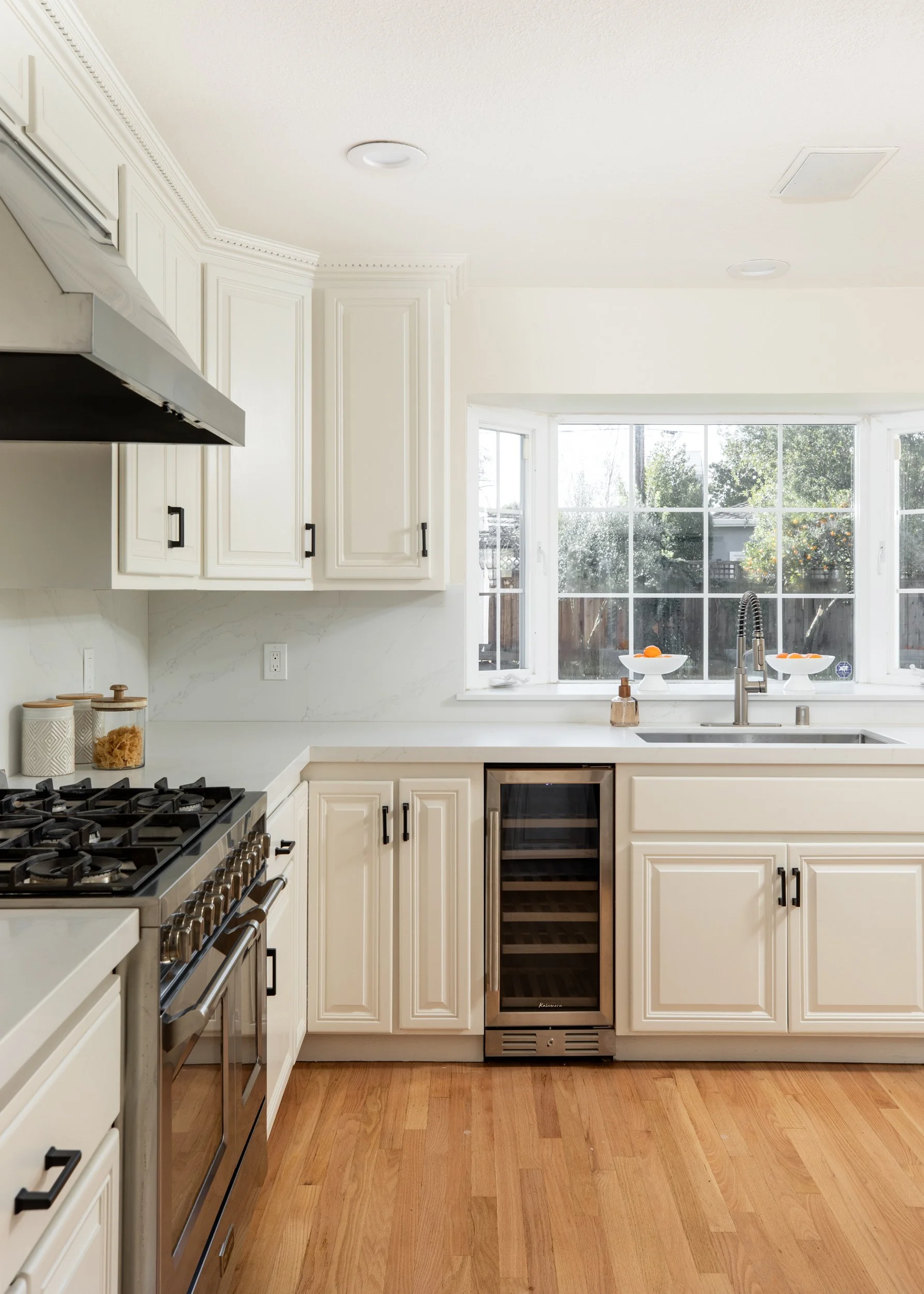 Remodeled kitchen with newly installed quartz countertops and stainless steel appliances, including a new dishwasher and wine refrigerator