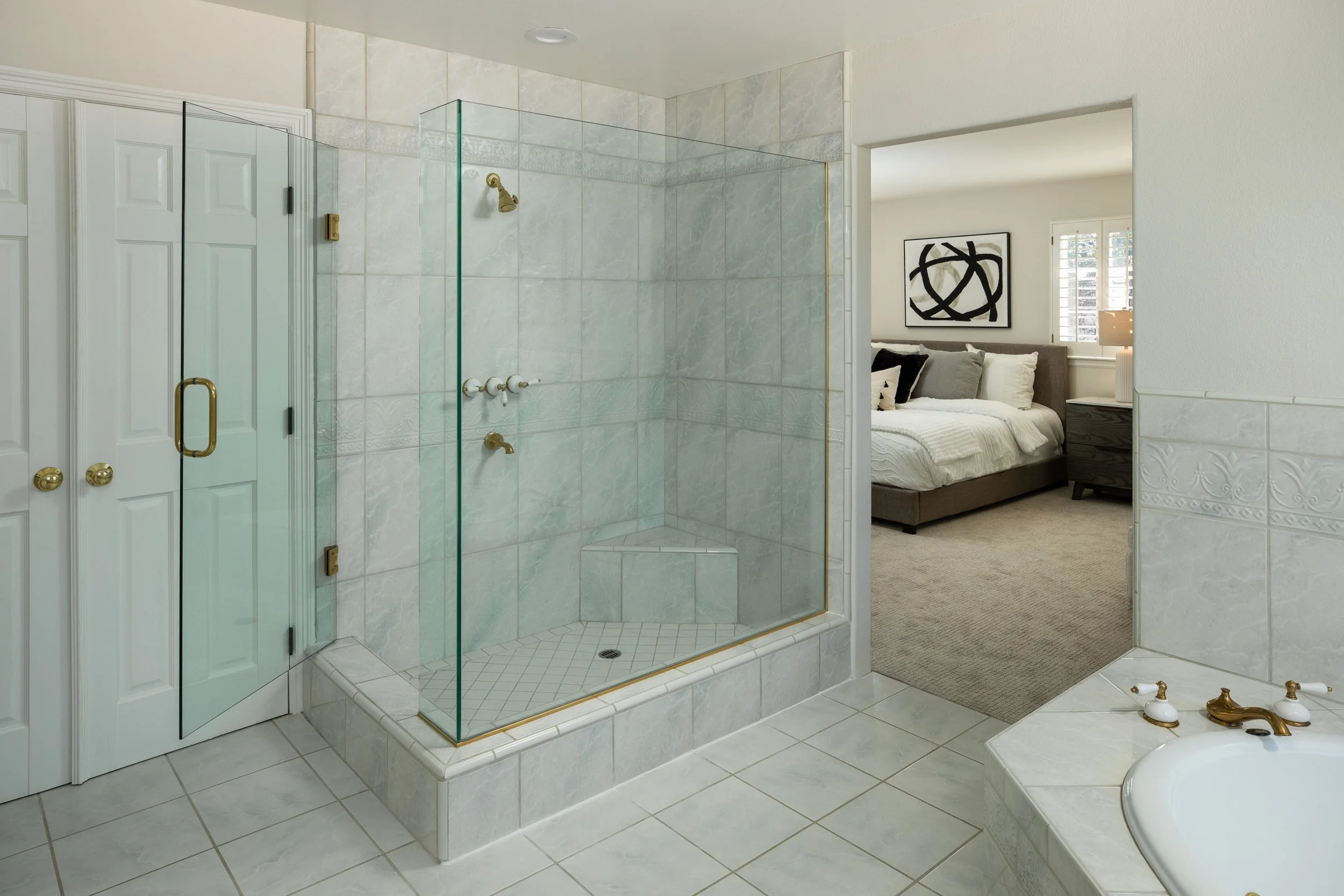 Large primary suite and bath with a Jacuzzi tub, separate shower and walk in closet.